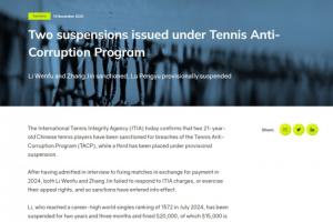 21歲的網球選手李文夫與張瑾在2024年的調查中坦言,此前為獲取報酬參與了比賽操縱。因為二人未對ITIA指控作出回應,也未行使上訴權利,相關制裁已正式生效。